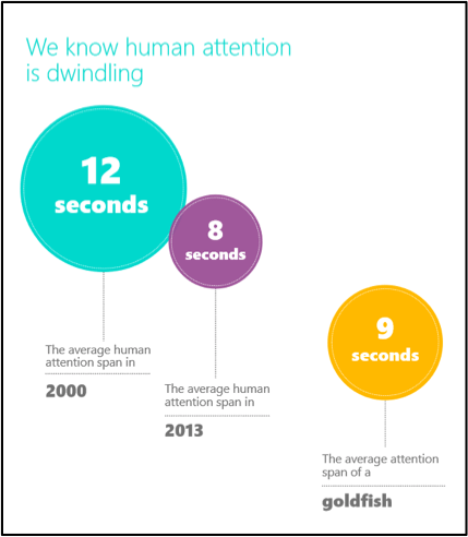 “Did you know that humans now have shorter attention spans than goldfishes? A 2015 study conducted by Microsoft in Canada showed that the average attention span of humans has decreased by 4 seconds in the past 15 years. From 12 seconds in 2000, last year’s study showed that it is now at 8.25 seconds only, largely due to the advent of smartphones. This is actually a tad shorter compared to the attention span of goldfishes who are clocking in at 9 seconds.”
