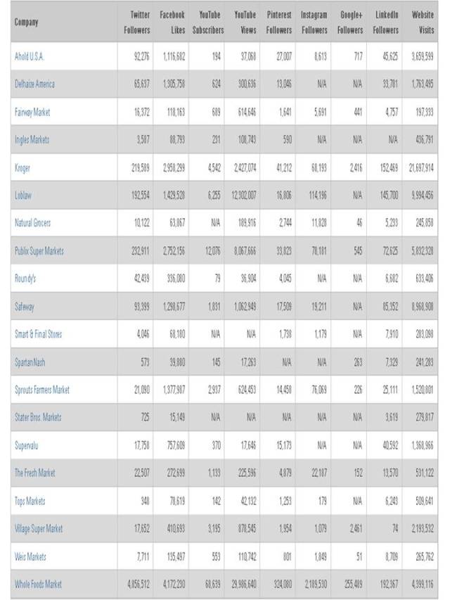 The eMarketer chart shown below highlights social media involvement for 20 supermarket chains. [Click the image for a larger version of the table.] Whole Foods dominates across platforms!