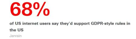“Most Americans would like to see GDPR-style laws enacted in the U.S., a new survey found. Identity management company Janrain polled U.S. Ïnternet users in April, putting this question to respondents: ‘The General Data Protection Regulation (GDPR) will give European Union citizens greater control over how businesses can use their personal data. Would you like to see similar laws enacted in the U.S.?’ Fully 68% said yes, while 10% said no and the remainder were unsure.”